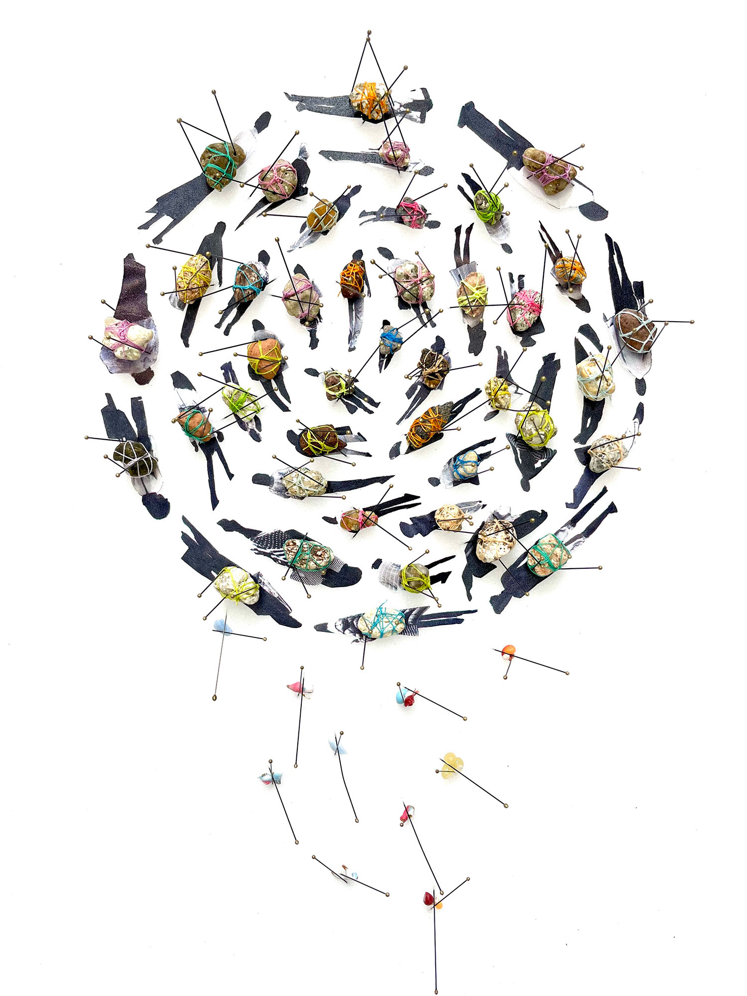 À la manière d’un entomologiste, LOrka capture et classe des portraits anonymes pris de dos, en marche. Découpés, assemblés et « épinglés » dans des boîtes, ces fragments de vies figées deviennent foule. Ici, l’épingle n’est pas mortifère : elle rend la pulsation vitale.